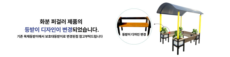 화분벤치 + 지붕 구성으로 재탄생한 퍼걸러입니다 지붕이 있어 사계절 내내 사용가능합니다. 특수보호대 장착으로 안정성을 높인 제품입니다.